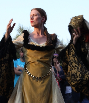 Da war ich nun also bei dieser Theaterpremiere. Hatte mich vorher belesen, drüber gebloggt – und wusste doch nicht wirklich, was mich erwarten würde. Ein multilinguales Interaktionstheater? Bewegung im Park? Verschiedene jahrhundertealte Texte, miteinander verkreuzt? Zunächst einmal erwartete mich, einen kleinen, schwarz gekleideten Kamerapunkt im bewegten Görlitzer Park, nichts und niemand. Massen von Menschen ließen mich untergehen in einer Welle von Skurrilitäten: Den Theaterausgangspunkt suchend, sah ich mich zunächst zusammenhanglos konfrontiert mit dem eigenartigen Tanz eines zwei Meter großen, flauschigen gelben Bummi-Plüschbärs und einer menschenhohen Aufziehpuppe, die fortwährend gegen einen Mülleimer lief, umgeben von Fahrräder schiebenden Menschen und Kindern mit Bällen, die sie wieder und wieder in zum Glück noch nicht angezündete Grille schossen. Irritiert-überfordert bewegte ich mich vorsichtig durch diese offenbar ortsüblichen Installationen von A nach B und wieder zurück und traf endlich, mit etwa fünfzehnminütiger Verspätung und einem Tross ebenfalls die Shakespeare-Aufführung suchender Menschen – man hatte mir mein Ziel offenbar angesehen, sodass ich kleiner, ahnungsloser Punkt zu einem Magnet für Mitsuchende wurde – am rückseitigen Parkende ein. Mich erwarteten eine Wiese, eine breite Metallrutsche, in Tischdecken und Webpelzreste gewandete Menschen und eine Mauer aus Publikum, die ich recht problemlos durchdringen konnte für einen Platz in der ersten Rasenreihe.