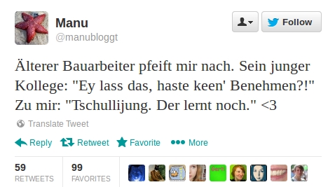 Heute in Pankow: Ich laufe an einer mit 3 Bauarbeitern besetzten Baustelle vorbei. Ein älterer Bauarbeiter hält beim Arbeiten inne, gafft. Unangenehm. Genau, als ich vorbei gehe, pfeift er auch noch. Jaja, nett gemeint und so, schon klar, kein Sexismus, schon klar, ich sag ja auch nichts, geh einfach vorbei, 100 x erlebt, die Sonne scheint und ich weiß ja, „es soll doch ein Kompliment sein“ und „ich soll mich nicht so haben“. Das Sagen übernimmt für mich aber doch jemand – der junge Kollege des Bauarbeiters. Der ruft nämlich in breitem Berliner Dialekt seinem Kollegen zu: „Ey lass das, haste keen‘ Benehmen?!“ – und sagt darauf noch zu mir: „Tschullijung. Der lernt noch.“