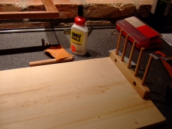 6) Nach mehreren missglückten Schraubversuchen, die schon fast zum ersten Einsatz des unentbehrlichen Verbandskastens geführt hätten, entschied ich mich dazu die Teile erst einmal mit Holzleim aneinander zu kleben und dann später zu verschrauben. Ich bohrte hierfür mit dem in den Akkuschrauber eingespannten Holzbohrer das völlig verklebte Loch der Holzkleberflasche auf, trug dann den Expressleim auf und bappte die Tellerhalter auf das Brett.