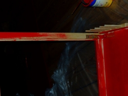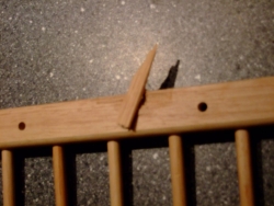 9) Inzwischen sollte ein Tellerhalter wieder vom Brett abgefallen sein und (nach Abschleifen der getrockneten Expressleimreste) nochmals mit einem Rest Klebstoff fixiert werden.