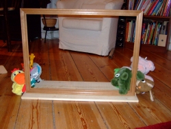 Als passionierte Geschichtenerzählerin hatte ich schon lange Lust, mit meinen Kindern Kasperletheater zu spielen. Nun gibt es im Handel zwar die unterschiedlichsten Ausführungen derselben zu kaufen, aber die, die mir gefielen, waren immer viel zu sperrig oder / und zu teuer. Als ich in Frankreich ein Puppentheater aus Holz sah, welches nicht wie ein festes Möbelstück in den Raum gestellt werden, sondern wie ein Rahmen auf den Schrank geräumt werden kann, kam mir die Idee: Mit einem normalen Bilderrahmen müsste man so etwas doch auch ganz einfach selbst herstellen können! Und so tat sie.