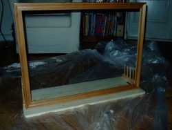 2) Zunächst habe ich Rahmen und Tellerhalter provisorisch aufs Brett gestellt und alles markiert. Dabei fiel mir auf, dass der Rahmen an der Rückseite doch leider nicht so schön glatt war wie vorn, und ich ihn also