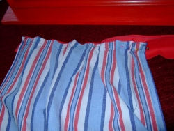 Ich habe die beiden Vorhangteile jeweils breiter gelegt (je 2/3 der Rahmenbreite) und dann von dem Stoffüberschuss Falten eingenäht, das fand ich persönlich hübscher. Beide Vorhangteile wurden dann nebeneinander gegen einen schmaleren Streifen roten Stoff genäht.