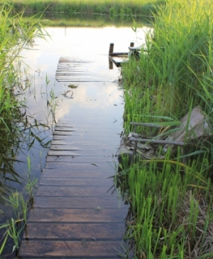 Und dann findest du am Außenlagerplatz, einem kleinen Nicht-Mal-Zeltplatz mit herzigem Plumpsklo und im Wasser versinkendem Steg (hier Piotrs Winterimpression von selbigem, weiter unten ein Foto von mir) am Ufer eines Flusses eine Galerie und triffst dort Menschen, die unglaublicherweise Menschen kennen, die du selbst kennst in irgendwelchen nahen oder fernen Großstädten dieser Welt, du unterhältst dich mit ihnen einen kurzen Abendmoment lang über Politik und Nationalismen und Mehrsprachigkeit und Schulsysteme – und du merkst, dass die Welt eben doch ein Dorf ist.