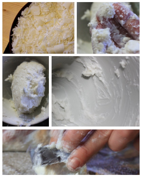 Matscht alles mit den Händen zu einer schön klebrigen, nicht flüssigen Seifenbreipampe durch. Wenn die Masse geschmeidig ist, ist es perfekt. Meine war doch sehr „stückig“, daher habe ich versucht, mit dem Pürierstab die gröbsten Brocken rauszubekommen. Ging nur mäßig gut, habe dann mit den Händen fleißig weiter gequetscht.