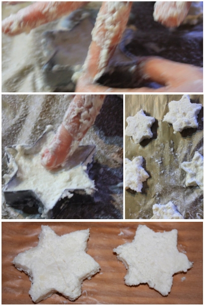 Die Masse habe ich dann zu einem Klumpen geformt und als dicke Rolle auf dem Backpapier ausgerollt. Für die Sternenform hab ich immer einen Teil der Masse in ein Plätzchen geschmiert, festgedrückt, glattgestrichen, umgedreht (das hebt sich gut von dem Backpapier hoch!), wieder mit den Fingern möglichst glatt gestrichen und dann vorsichtig aus der Form gedrückt. Anschließend kann man die Spitzen noch mal nachformen und mit nem Messer die Oberfläche glätten. Auf dem Backpapier trocknen lassen, hübsch einpacken, fertig!