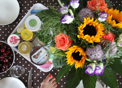 Nach-Hause-Kommen aus dem Zeltlager: Mit mückenbestochenen, barfußlaufsandigen Dreckübertünch-Nagellack-Sommerfüßen zu Hause als allererstes auf den Frühstückstisch geklettert, um ein Luftbild vom schier unglaublichen Frühstück – statt der aus den letzten Wochen gewöhnten Kombination Margarine-Brotkiste-Müsli heute Croissants, Konfitüre, Kaffee, Kirschen,.. an Blumenstrauß – zu machen. Und der Liebste hatte sich auch noch frei genommen für diesen Tag. Oh, Baby!.. – wenn das keine perfekte Rückkehr ist.
