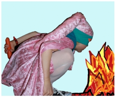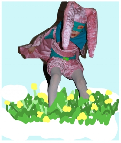 „Hoffen wir, dass es noch nicht zu spät ist! Schnell noch die Hasenpfoten abgelegt, Karottensaft gibt immer so ungleichmäßige Flecken, dann schimpft Osterhasi wieder.“
